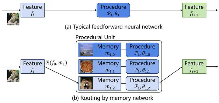 Recent Convolutional Neural Networks (CNNs) have achieved significant success by stacking multiple convolutional blocks, named procedures in this paper, to extract semantic features. However, they use the same procedure sequence for all inputs, regardless of the intermediate features.This paper proffers a simple yet effective idea of constructing parallel procedures and assigning similar intermediate features to the same specialized procedures in a divide-and-conquer fashion. It relieves each procedure’s learning difficulty and thus leads to superior performance. Specifically, we propose a routing-by-memory mechanism for existing CNN architectures. In each stage of the network, we introduce parallel Procedural Units (PUs). A PU consists of a memory head and a procedure. The memory head maintains a summary of a type of features. For an intermediate feature, we search its closest memory and forward it to the corresponding procedure in both training and testing. In this way, different procedures are tailored to different features and therefore tackle them better.Networks with the proposed mechanism can be trained efficiently using a four-step training strategy. Experimental results show that our method improves VGGNet, ResNet, and EfficientNet’s accuracies on Tiny ImageNet, ImageNet, and CIFAR-100 benchmarks with a negligible extra computational cost.