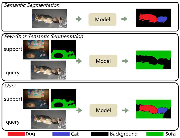 Semantic segmentation achieves significant success through large-scale training data. Meanwhile, few-shot semantic segmentation was proposed to segment image regions of novel classes through few labeled testing data. However, it ignores classes previously learned from training data. This paper proposes a new segmentation framework called segmentation by dynamic prototype (SDP), which can simultaneously segment the image regions of base classes learned from many training data and novel classes learned from a few testing data. SDP performs segmentation by searching for the nearest prototype of each pixel’s features. Different prototypes are representative features for different classes. In testing, SDP dynamically constructs novel prototypes according to support images while maintaining base prototypes learned from training images. The main challenge of SDP is how to achieve intra-image compactness, intra-class compactness, and inter-class separability simultaneously in the feature space. To tackle these challenges, we first introduce a discriminative pixelwise feature and prototype training method to improve the above three types of feature discriminability. We then introduce a mask refinement process in testing, which refines support images’ masks to extract more separable novel prototypes. In addition, we introduce a prototype adaptation process in testing, which allows all prototypes to adapt to query images to reduce the prototypes’ intra-class variances. Our approach achieves state-of-the-art results for novel class segmentation against existing few-shot semantic segmentation methods on PASCAL-5i and COCO-20i benchmarks in combination with superior runtime efficiency. In addition, our method can maintain strong results in the segmentation of base classes.