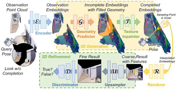 We introduce a scalable framework for novel view synthesis (NVS) from RGB-D images with largely incomplete scene coverage. While generative neural approaches have demonstrated spectacular scene completion results on 2D images, they have not yet achieved similar photorealistic results in combination with NVS for which a spatial 3D scene understanding is essential. To this end we propose a sparse grid-based neural scene representation which is learned with a generative component to complete unobserved scene parts via a learned distribution of plausible scenes. We process encoded image features in 3D space with a geometry prediction network and a subsequent texture completion network. To keep the computational cost viable, consistency-relevant 3D operations are performed on a moderate resolution which is subsequently upsampled in the 2D domain after differentiable rendering. A 2D discriminator governs the training of the entire 2.5D-to-3D-to-2.5D pipeline in a fully end-to-end manner. The graphical outputs of our method outperform state-of-the-art NVS methods especially within unobserved scene parts.
