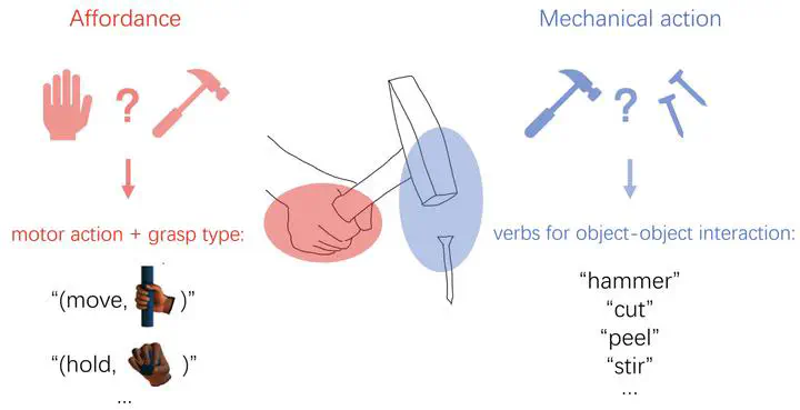 Object affordance is an important concept in hand-object interaction, providing information on action possibilities based on human motor capacity and objects’ physical property thus benefiting tasks such as action anticipation and robot imitation learning. However, the definition of affordance in existing datasets often: 1) mix up affordance with object functionality; 2) confuse affordance with goal-related action; and 3) ignore human motor capacity. This paper proposes an efficient annotation scheme to address these issues by combining goal-irrelevant motor actions and grasp types as affordance labels and introducing the concept of mechanical action to represent the action possibilities between two objects. We provide new annotations by applying this scheme to the EPIC-KITCHENS dataset and test our annotation with tasks such as affordance recognition, hand-object interaction hotspots prediction, and cross-domain evaluation of affordance. The results show that models trained with our annotation can distinguish affordance from other concepts, predict fine-grained interaction possibilities on objects, and generalize through different domains.