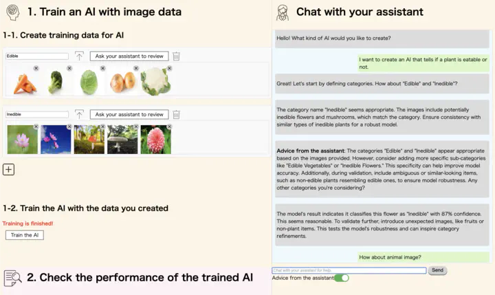 This paper proposes a system based on a multimodal large language model (MLLM) to assist non-expert users without prior experience in machine learning (ML) development. The MLLM assistant in our system interactively helps users compile their requirements and create appropriate training data while building an ML model. It has been reported that users often struggle to define training data that comprehensively covers all samples or aligns with their needs. To prevent such failures, the MLLM assistant monitors the user’s interaction process and translates users’ vague needs into concrete ML formulations through chat, ultimately facilitating the creation of appropriate training data.