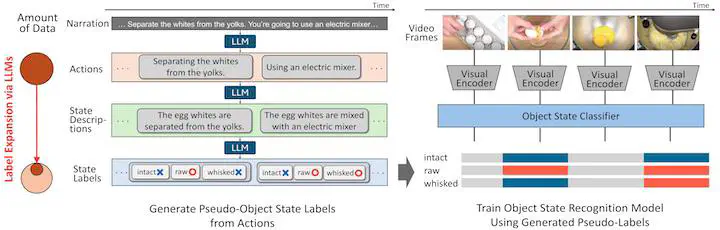 Recognizing the states of objects in a video is crucial in understanding the scene beyond actions and objects. For instance, an egg can be raw, cracked, and whisked while cooking an omelet, and these states can coexist simultaneously (an egg can be both raw and whisked). However, most existing research assumes a single object state change (e.g., uncracked -> cracked), overlooking the coexisting nature of multiple object states and the influence of past states on the current state. We formulate object state recognition as a multi-label classification task that explicitly handles multiple states. We then propose to learn multiple object states from narrated videos by leveraging large language models (LLMs) to generate pseudo-labels from the transcribed narrations, capturing the influence of past states. The challenge is that narrations mostly describe human actions in the video but rarely explain object states. Therefore, we use the LLMs knowledge of the relationship between actions and states to derive the missing object states. We further accumulate the derived object states to consider past state contexts to infer current object state pseudo-labels. We newly collect a dataset called the Multiple Object States Transition (MOST) dataset, which includes manual multi-label annotation for evaluation purposes, covering 60 object states across six object categories. Experimental results show that our model trained on LLM-generated pseudo-labels significantly outperforms strong vision-language models, demonstrating the effectiveness of our pseudo-labeling framework that considers past context via LLMs.