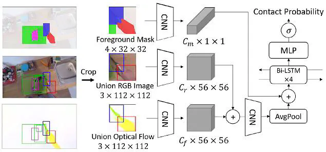 Every hand-object interaction begins with contact. Despite predicting the contact state between hands and objects is useful in understanding hand-object interactions, prior methods on hand-object analysis have assumed that the interacting hands and objects are known, and were not studied in detail. In this study, we introduce a video-based method for predicting contact between a hand and an object. Specifically, given a video and a pair of hand and object tracks, we predict a binary contact state (contact or no-contact) for each frame. However, annotating a large number of hand-object tracks and contact labels is costly. To overcome the difficulty, we propose a semi-supervised framework consisting of (i) automatic collection of training data with motion-based pseudo-labels and (ii) guided progressive label correction (gPLC), which corrects noisy pseudo-labels with a small amount of trusted data. We validated our framework’s effectiveness on a newly built benchmark dataset for hand-object contact prediction and showed superior performance against existing baseline methods.
