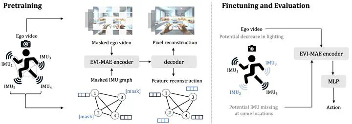Compared with visual signals, Inertial Measurement Units (IMUs) placed on human limbs can capture accurate motion signals while being robust to lighting variation and occlusion. While these characteristics are intuitively valuable to help egocentric action recognition, the potential of IMUs remains under-explored. In this work, we present a novel method for action recognition that integrates motion data from body-worn IMUs with egocentric video. Due to the scarcity of labeled multimodal data, we design an MAE-based self-supervised pretraining method, obtaining strong multi-modal representations via modeling the natural correlation between visual and motion signals. To model the complex relation of multiple IMU devices placed across the body, we exploit the collaborative dynamics in multiple IMU devices and propose to embed the relative motion features of human joints into a graph structure. Experiments show our method can achieve state-of-the-art performance on multiple public datasets. The effectiveness of our MAE-based pretraining and graph-based IMU modeling are further validated by experiments in more challenging scenarios, including partially missing IMU devices and video quality corruption, promoting more flexible usages in the real world.